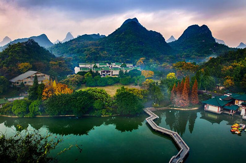 桂林西山景區(qū)位于桂林市中心,是國家4A級景區(qū),占地面積125萬平方米,早在1000多年前的唐代便成為旅游勝地,是桂林最早被開發(fā)的旅游景區(qū)。景區(qū)由西山群峰、西湖及隱山組成,里面群峰環(huán)繞聳立,西湖、桃花江相映帶,形成山重水復(fù)的奇景。每近黃昏,夕陽斜掛山峰,云林變幻、金光萬道、紫氣蒸騰,是為膾炙人口的桂林老八景之“西峰夕照”。
