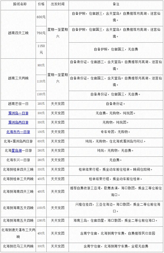 廣西北海康輝旅行社提供2016年6月北海旅游路線報價表。以下提供的旅游路線報價均是按我社標準公布,其它旅行社報價不做比較。(單位:元/人)
