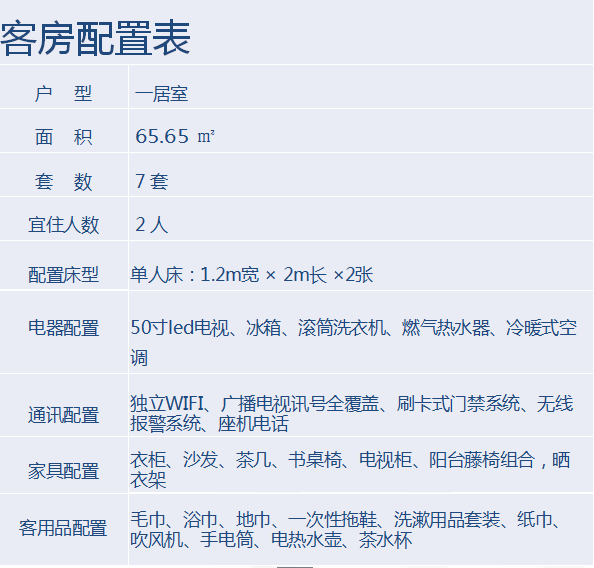 項目配套:客房服務、休閑茶吧、棋牌室、國安食堂、社區班車、兒童活動區