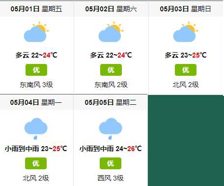 五一節放假從5月1日起至5日止,通過天氣網查詢到的天氣情況是5月1日至5月3日屬于晴天,多云;最高溫度是25度,最低溫度是23度;5月4日至5日有小到中雨,最高溫度是26度,最低溫度是23度。如果從天氣預報上來說5月1日至3日是出行的最佳時間,不過大家有沒有注意到5月4日、5日天氣預報有雨,但是氣溫卻比之前要高。所以根據在北海生活了10年的經驗,5月4日、5日下雨的可能性并不大。因為下雨的氣溫比不下雨天都要高,這就是不正常的天氣。