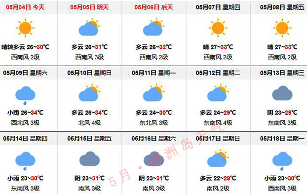 5月份開始,潿洲島就進入初夏;這個時候潿洲島的平均氣溫都在26度到32度之間。到潿洲島白天建議大家穿輕棉織物的短衣、短裙、薄短裙、短褲等清涼透氣的衣服;夜間建議穿棉麻面料的襯衫、薄長裙、薄T恤等清涼透氣的衣服。