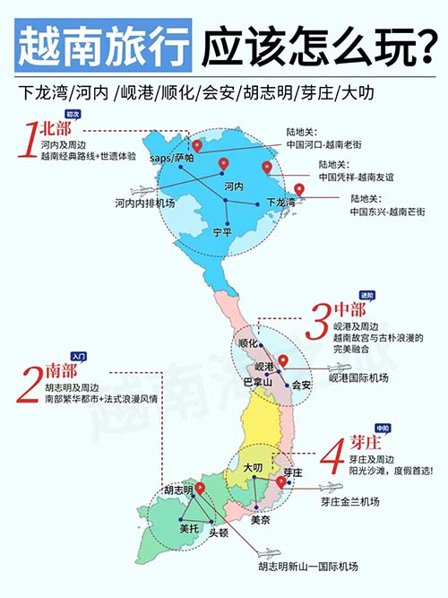 越南旅游可分為四部分,北部、中部、南部、芽莊;
